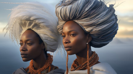 A close-up portrait of two beautiful young African women in traditional bright clothes.