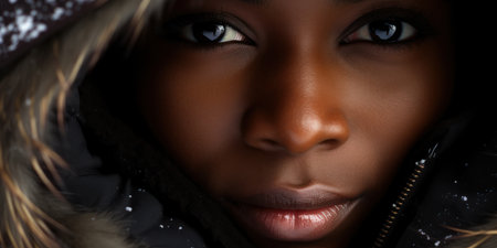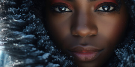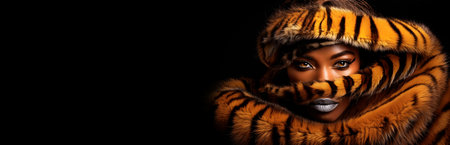 Extreme close-up, portrait of a young beautiful African-American woman looking at camera with a determined look, wrapped in a tiger fur, isolated on a black background with copy space. Generative Ai.