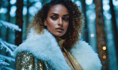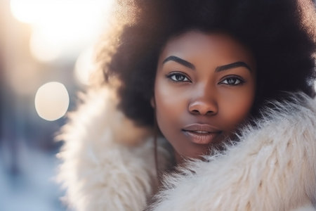 This striking portrait captures the essence of a confident woman with dark skin, featuring exquisite jewelry and fur, illuminated by warm natural light.