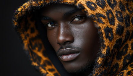 Model wearing an animal print hooded outfit against a dark background