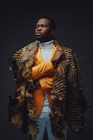 Stylishly dressed dark-skinned man wearing a yellow jacket and wild animal fur