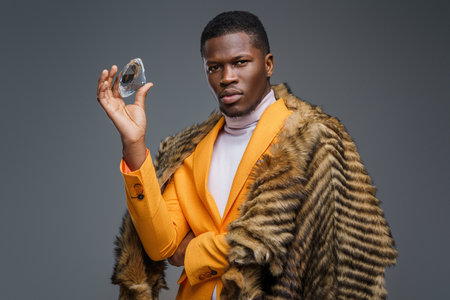 Dapper dark-skinned man showcasing an enormous diamond on a gray background