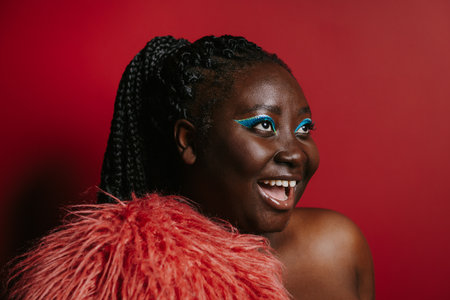 Fashionable plus size African woman with beautiful make-up wearing fluffy coat on red background