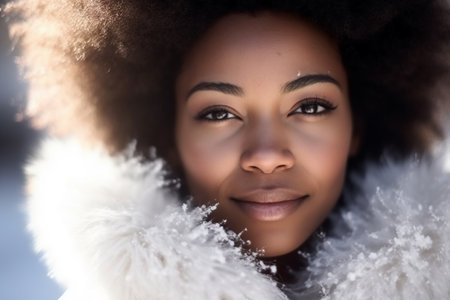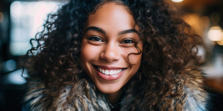 Cheerful African curly woman portrait in winter. Pretty female in warm coat wintertime weather. Generate ai