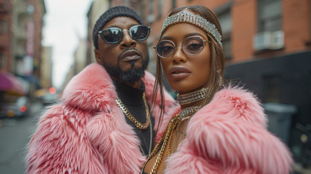 A man and a woman in pink fur coats standing on a street in America. A prostitute and a pimp on the streets of Harlem.