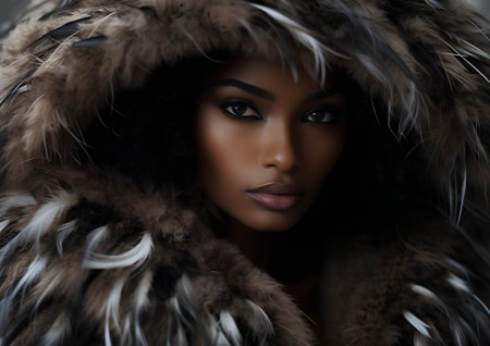 Beautiful african american woman in fur coat with feathers.