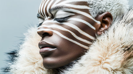 A detailed portrait highlighting vivid facial markings and traditional fur attire, celebrating indigenous elegance and Earth's raw beauty.