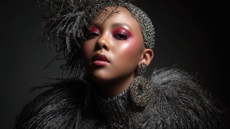 High-fashion portrait with bold lighting and makeup, black background, studio shoot quality.