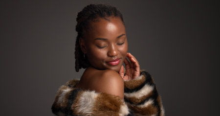 Beauty, fashion and portrait with black woman on studio space for cosmetics or dermatology. Aesthetic, fur coat and pride with confident African model isolated on gray background for skincare