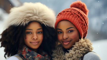 Portrait of two young, beautiful, smiling and happy African-American girls against the backdrop of a winter snowy landscape. Concept of traveling around the world, recreation, winter sports, vacations, tourism in the mountains and unusual places.