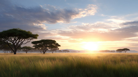 A breathtaking view of a serene sunrise illuminating vast grasslands, highlighted by silhouetted trees and a colorful sky, embodying tranquility and natural beauty.