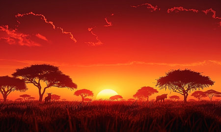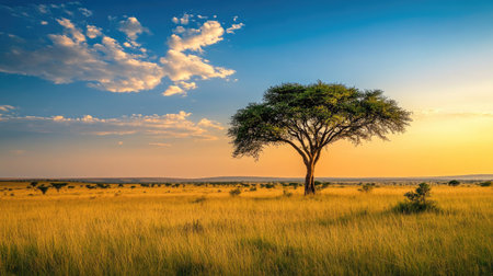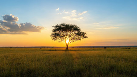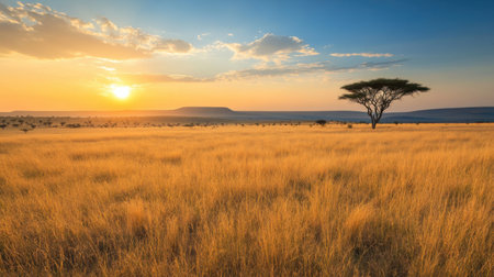 Sunset over a vast savanna with golden grasslands and a silhouette of an acacia tree