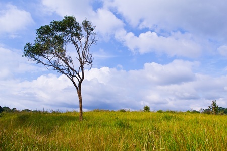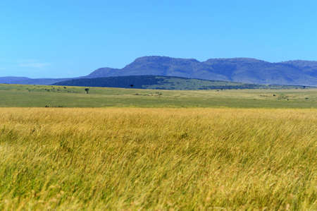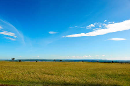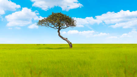 Lonely tree in the middle of a grassy savannah. The vast expanses of the Horn of Africa. The Masai Mara Reserve in Kenya. The concept of ecological, exotic, extreme and photo tourism