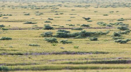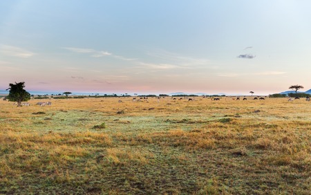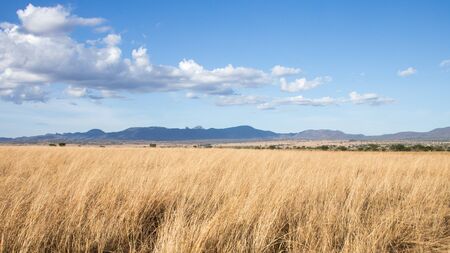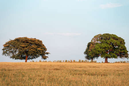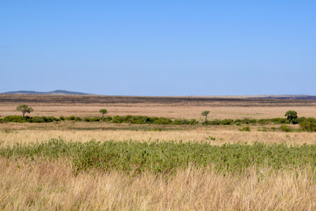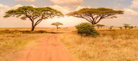 African savannah in the spring. African Acacia is evergreen on the horizon. Ecological, exotic and photo tourism concept