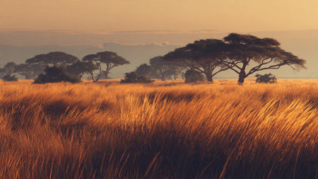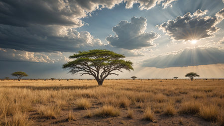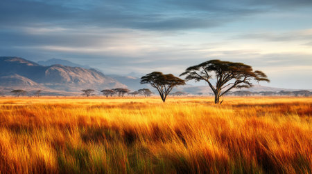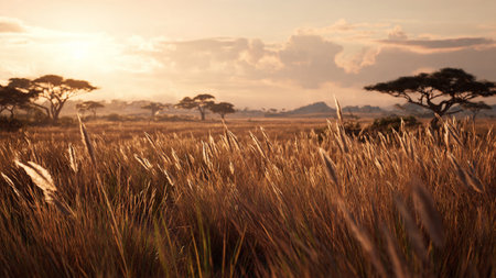 A breathtaking savanna scene showcases golden grasses swaying under the gentle breeze, with striking acacia trees set against a dramatically lit sky in an African landscape.