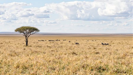 Panoramic image of a lonely acacia tree in Savannah in Serengeti National Park, Tanzania - Safari in Africa