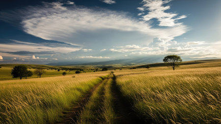 A tranquil landscape featuring golden grasses swaying gently in the breeze, distinct trees silhouetted against a dramatic sky, creating a serene and picturesque scene.