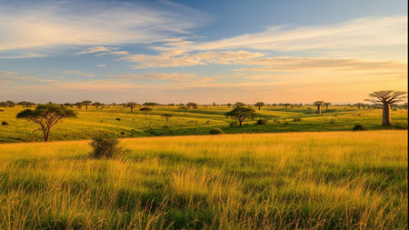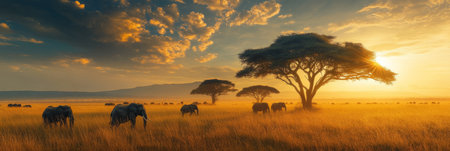 An African savanna landscape at sunset, with golden skies illuminating the tranquil, endless plains in a dramatic, banner