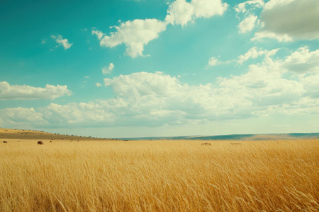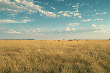 Beautiful wide shot of the African savanna with tall grass, vast landscape, animals in the distance, blue sky with clouds, cinematic, natural lighting, professional color grading, soft shadows, low contrast, clean sharp focus, in the style of National Geographic. --ar 3:2 --v 6.1 Job ID: 12a3ce74-58f5-4a69-bc00-c1250a6d910f