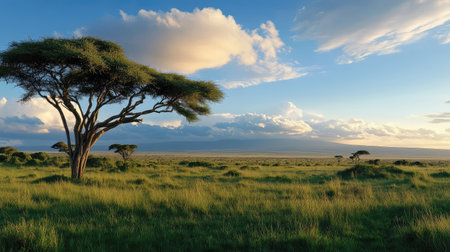 Captivating view of an acacia tree standing tall in an expansive grassland, framed by majestic mountains and a colorful sky during sunrise or sunset, showcasing the serenity of nature.