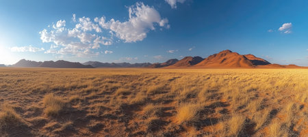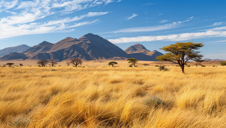 This breathtaking panorama of an African landscape is the perfect image to capture the dreamy beauty of the continent. With the vibrant colors of the orange sky and the majestic mountains in the background, it's a stunning scene that inspires awe and wonder. Africa, landscape, panorama, dreamy, sky,