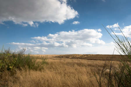 A panoramic view of a golden field of tall grass with a distant horizon under a blue sky, offering a serene and expansive nature background.