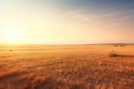 Golden sunlight fills the expansive African savanna at sunset, casting a peaceful, scenic across the wild grassland