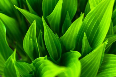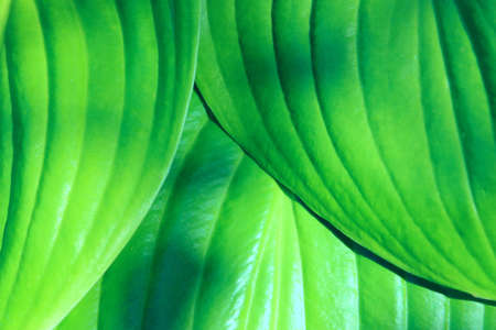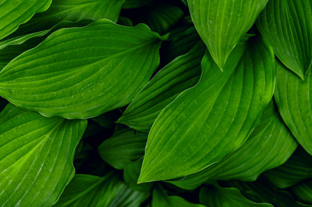 Minimalistic background with hosta leaves close - up view from above. The hosta leaves are a close-up of a bright green color. Beautiful large decorative leaves of an ever-green garden plant.