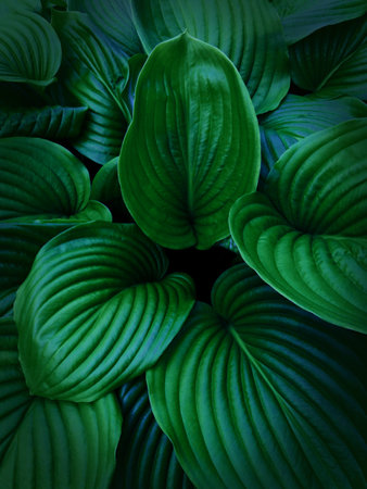 Fresh vibrant green leaves Hosta plant low key top view. Greenery background dark and moody style wallpaper screensaver. Dynamic backdrop. Botanical design, season gardening, natural flora environment