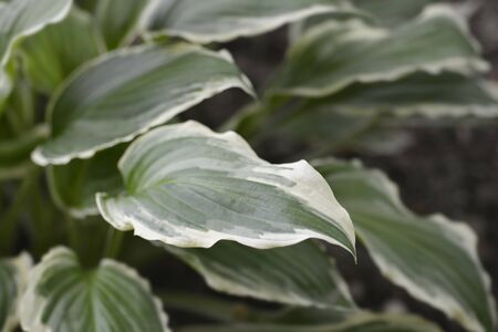 Green white leaves of hosta in garden close-up. Genus of perennial herbaceous plants of asparagus family. Shade-tolerant foliage in gardening and landscape design. Natural floral