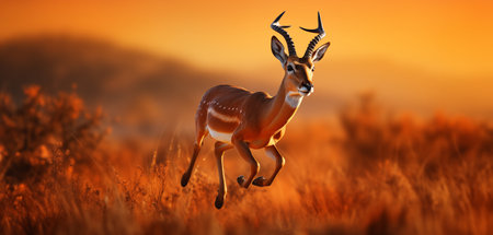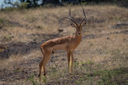 Antelope on the African savannah. Natural environment antelope habitat. Hoofed horned animal.