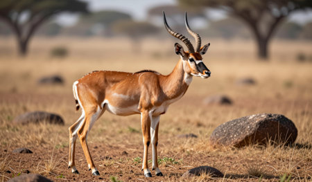 A graceful gazelle stands in a vibrant sunlit savanna, showcasing its elegant form against a backdrop of sparse, golden grass and rocky outcrops. Trees sway gently in the background.