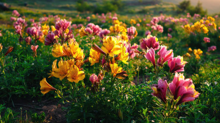 A captivating landscape showcases numerous blooming flowers in a field. The scene presents a vivid display of yellow, pink, and red blossoms set against lush green foliage. The composition uses natural sunlight to illuminate the scene. This image is suitable for various commercial uses such as advertising and editorial content.