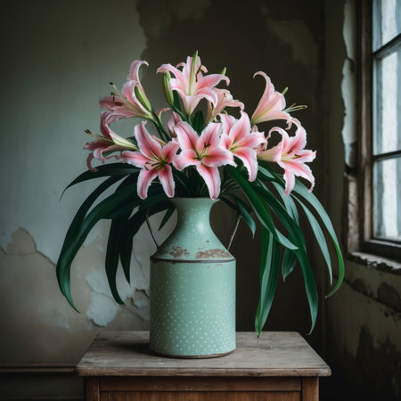 Lily in a vessel on a small wooden table, placed next to an old window. The soft light highlights the delicate blossoms and the weathered wall in the background.