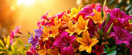A close-up photograph captures a vibrant bouquet of lilies in various shades of yellow, orange, pink, and purple, with their delicate petals and pollen illuminated by warm sunlight.