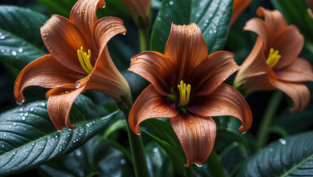 A delicate lily with droplets of water on its petals, reflecting light and color, surrounded by lush green leaves, creating a beautiful nature composition