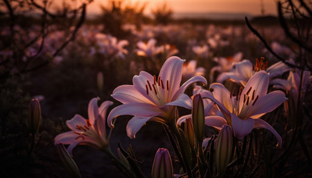 A stunning photo of vibrant pink lilies blooming in a serene garden at sunset, capturing the beauty of nature's colors and the elegance of floral life.