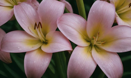 Festive floral background with wet pink lilies close up. Waterdrops on delicate pink petals - symbol of purity, harmony, freshness and love. Greeting card for any holidays or festive events