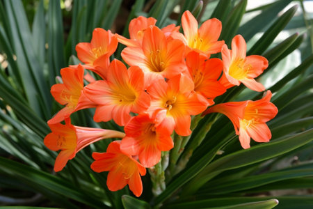 A cluster of delicate white flowers featuring bright orange centers stands tall in a lush garden. Springtime sunlight highlights their beauty and freshness.