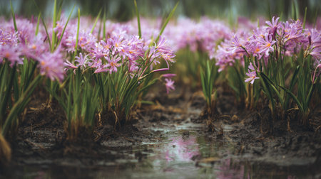 A panoramic wide view of Nerine field growing closely together after rain wet leaves reflecting soft light fresh soil visible ultra realistic photography cinematic wide composition lifelike natural scene