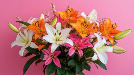 A stunning bouquet featuring vibrant mixed lilies in white, pink, orange, and yellow, beautifully arranged against a soft pink backdrop, perfect for enhancing any floral decor.