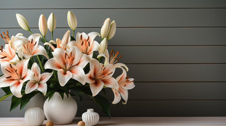 Delicate lily flowers on white wooden backgroud. Generative AI.