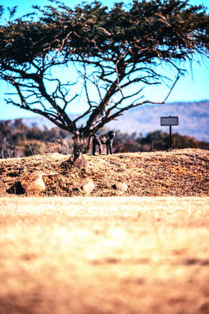 Chacma Baboon under a tree with sign at National Park, South Africa.