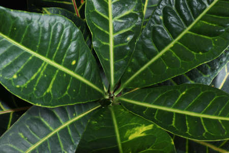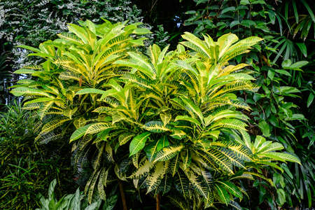 Croton (Codiaeum variegatum) tropical plant, close-up. Beautiful plants with varied foliage. Colorful Croton leaves background, top view