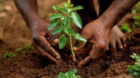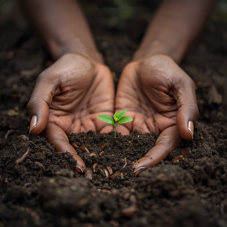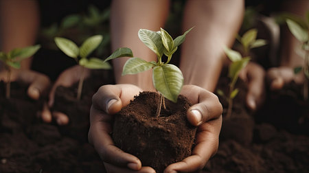 A close-up of hands planting a tree, symbolizing environmental impact and growth