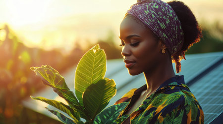 A young woman stands in a lush garden during sunset, delicately holding green leaves. Solar panels glint in the background, highlighting her connection to nature.