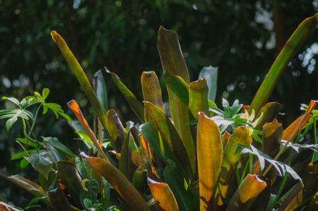 Beautiful tropical plants are growing and blooming in a botanical garden