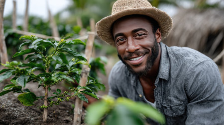 A joyful farmer tending to organic coffee plants in a vibrant plantation, showcasing sustainable agriculture in a lush, natural landscape.