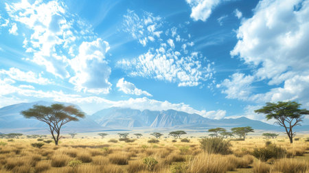 Stunning view of golden grasslands featuring scattered trees under a vibrant sky with fluffy clouds, embodying the serene beauty of the African savannah landscape.
