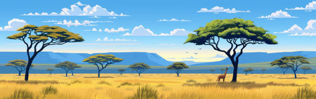 savanna stretches across the prairie landscape in this vibrant pixel art, showcasing a serene atmosphere with rolling hills, scattered acacia trees, and a warm golden light casting long shadows, evoking feelings of tranquility and adventure in the heart of the african wilderness. ai generated